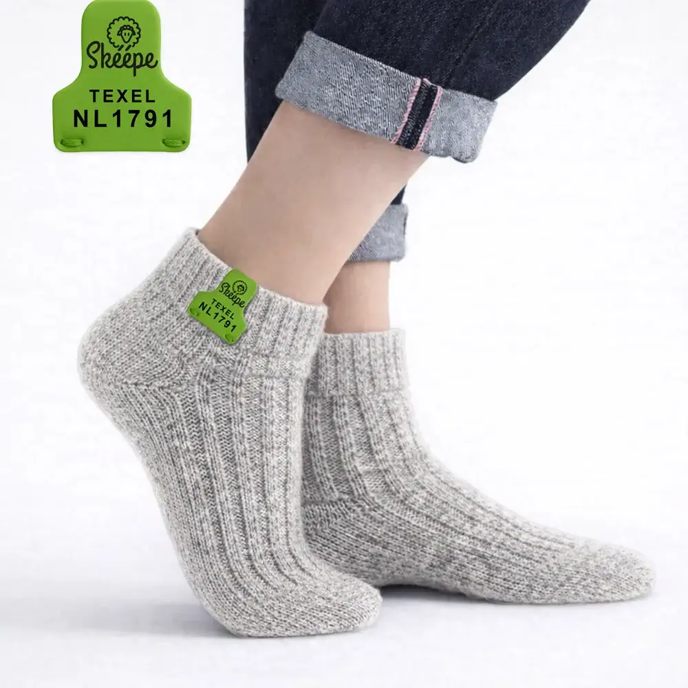 Diese hellgrauen Wollsöckchen von Skéépe werden aus der Wolle von Texeler Schafen hergestellt. Das kurze Modell reicht bis zum Knöchel und lässt sich angenehm in flachen Schuhen oder Sneakers tragen. Die Socken sind warm, atmungsaktiv und bequem und werden sowohl von Damen als auch von Herren getragen, die gerne auf natürliche Wollsocken setzen.